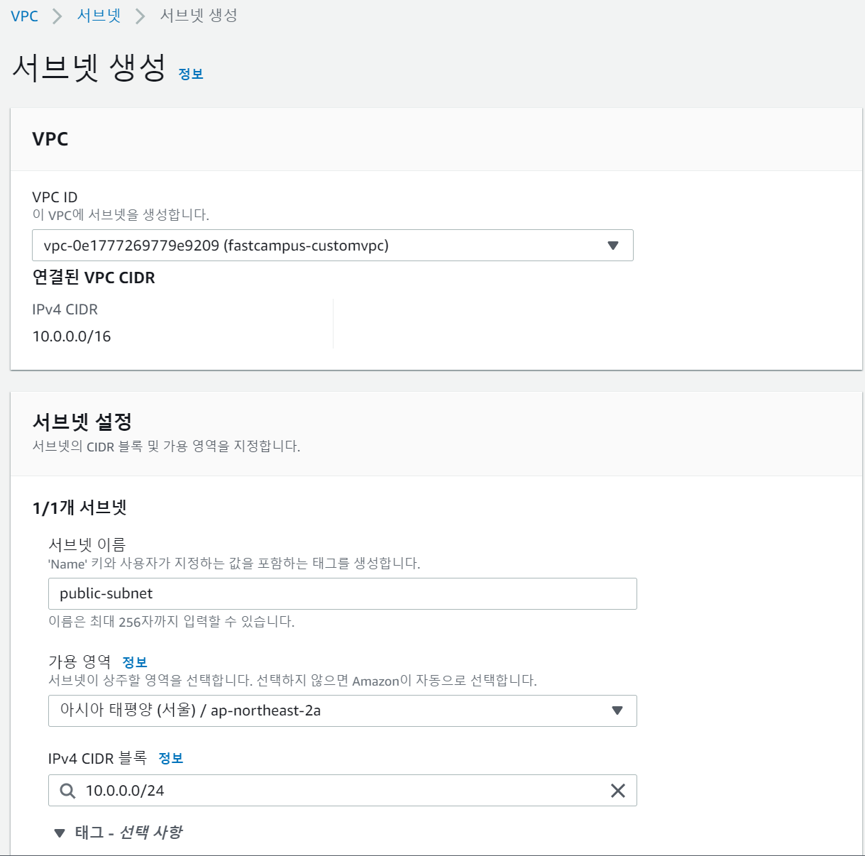 아까 만들어준 VPC를 연결시켜주고, 서브넷 이름은 public subnet으로 지어준다.