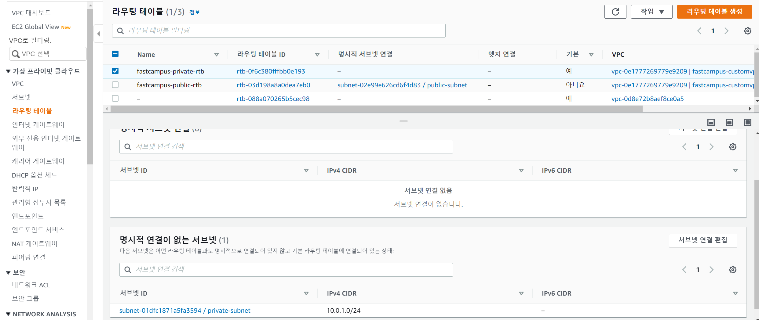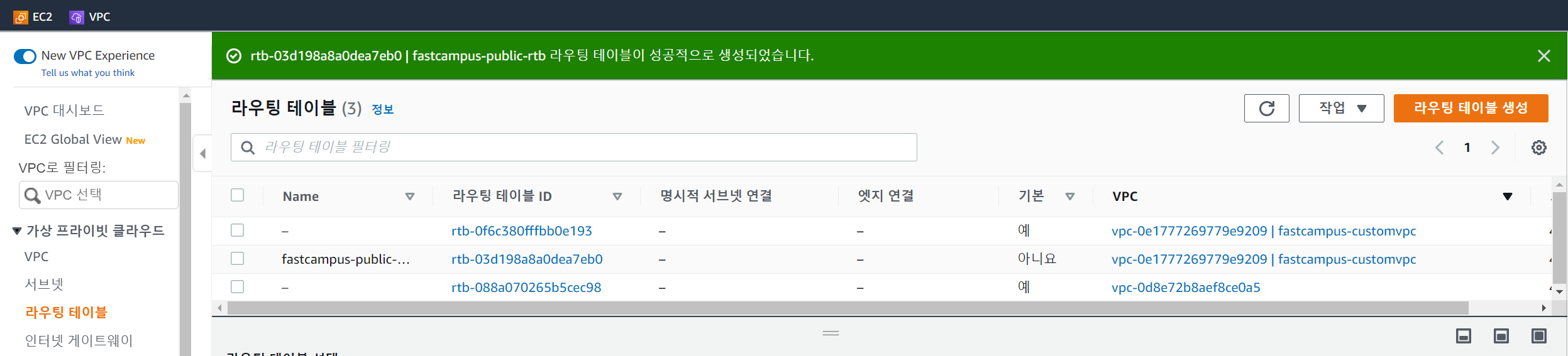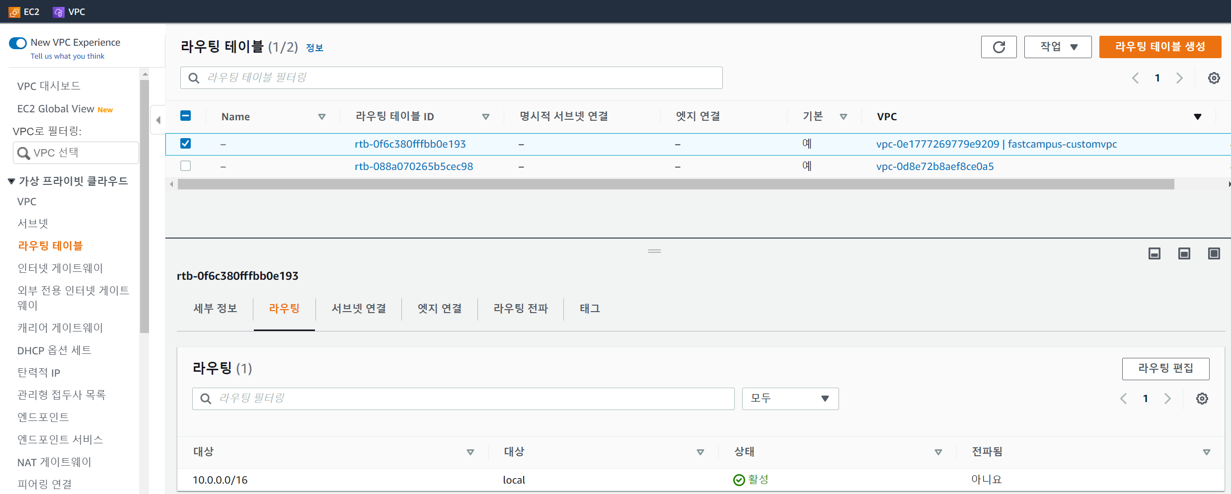 생성해주면 fastcampus-customvpc에 대해 디폴트로 존재하는(기본:예) 라우팅 테이블과 방금 생성해준 퍼블릭 라우팅 테이블이 있게된다.