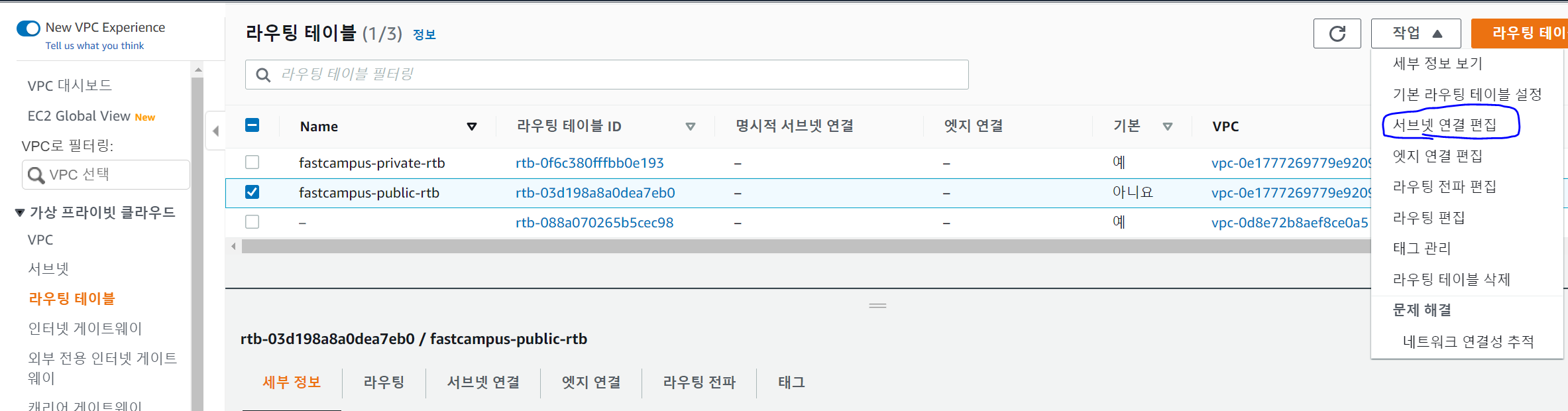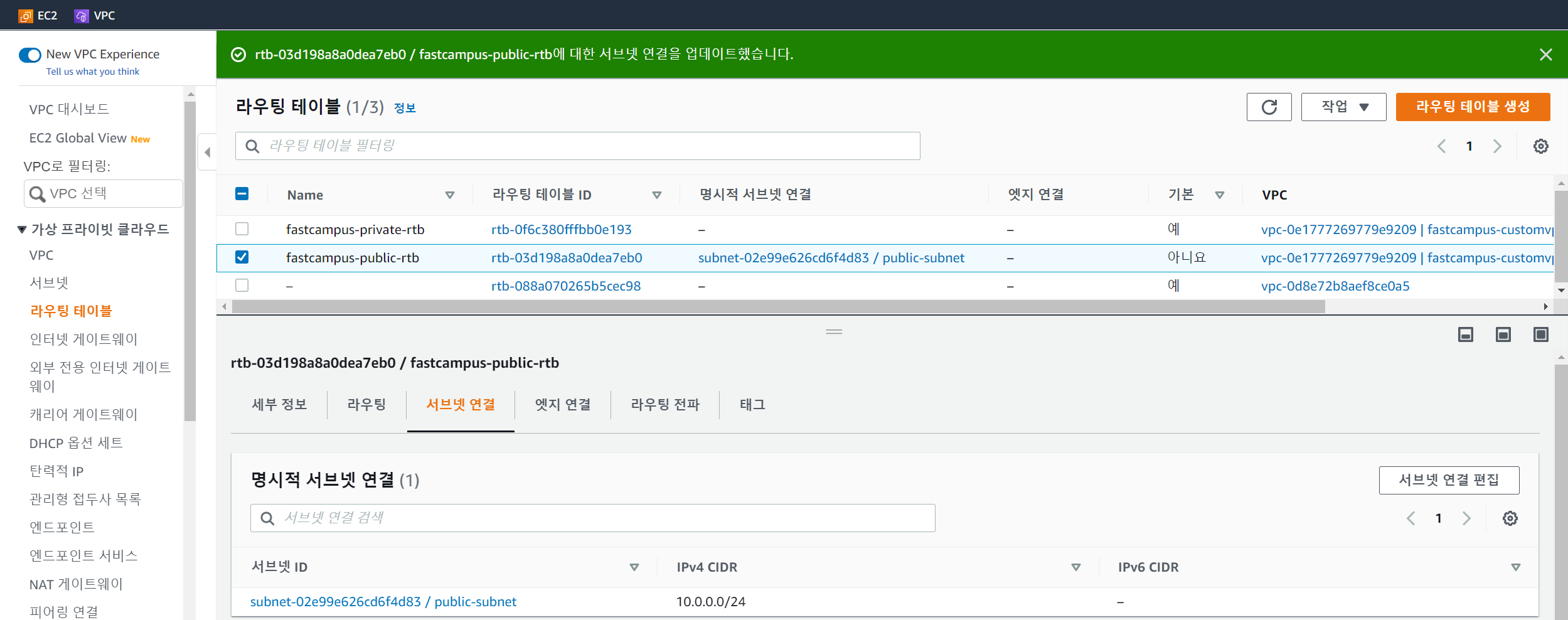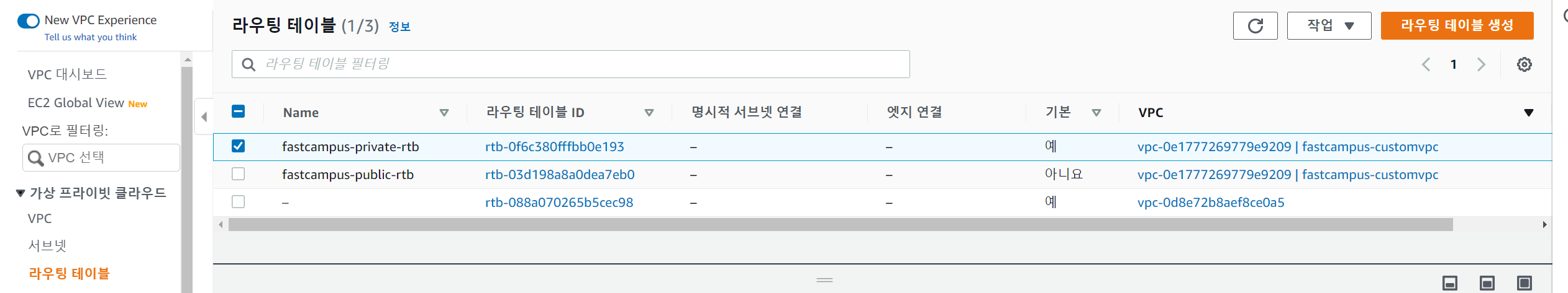 생성해주면 fastcampus-customvpc에 대해 디폴트로 존재하는(기본:예) 라우팅 테이블과 방금 생성해준 퍼블릭 라우팅 테이블이 있게된다.