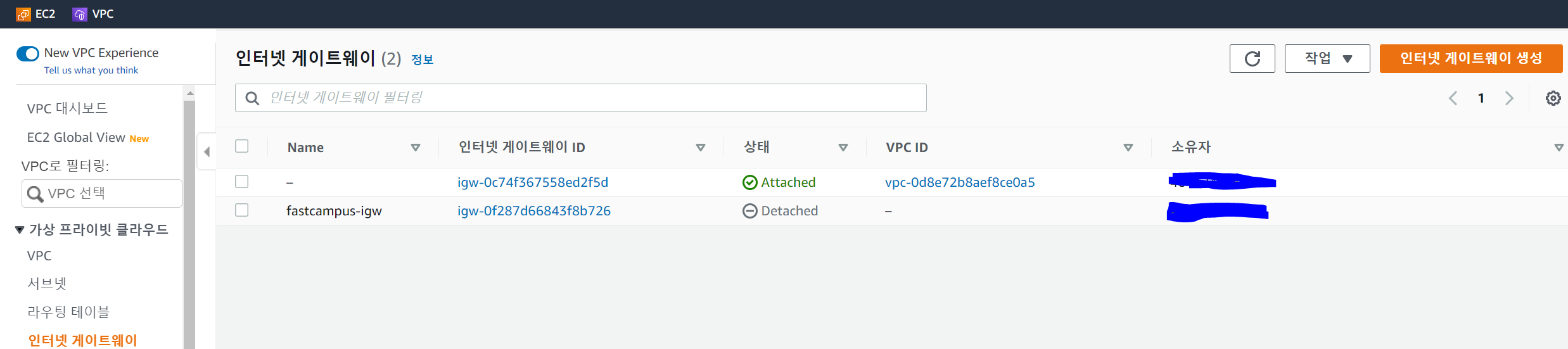 인터넷 게이트웨이를 VPC에 연결하기 위해 작업⇒VPC에 연결란을 통해 진입한다.