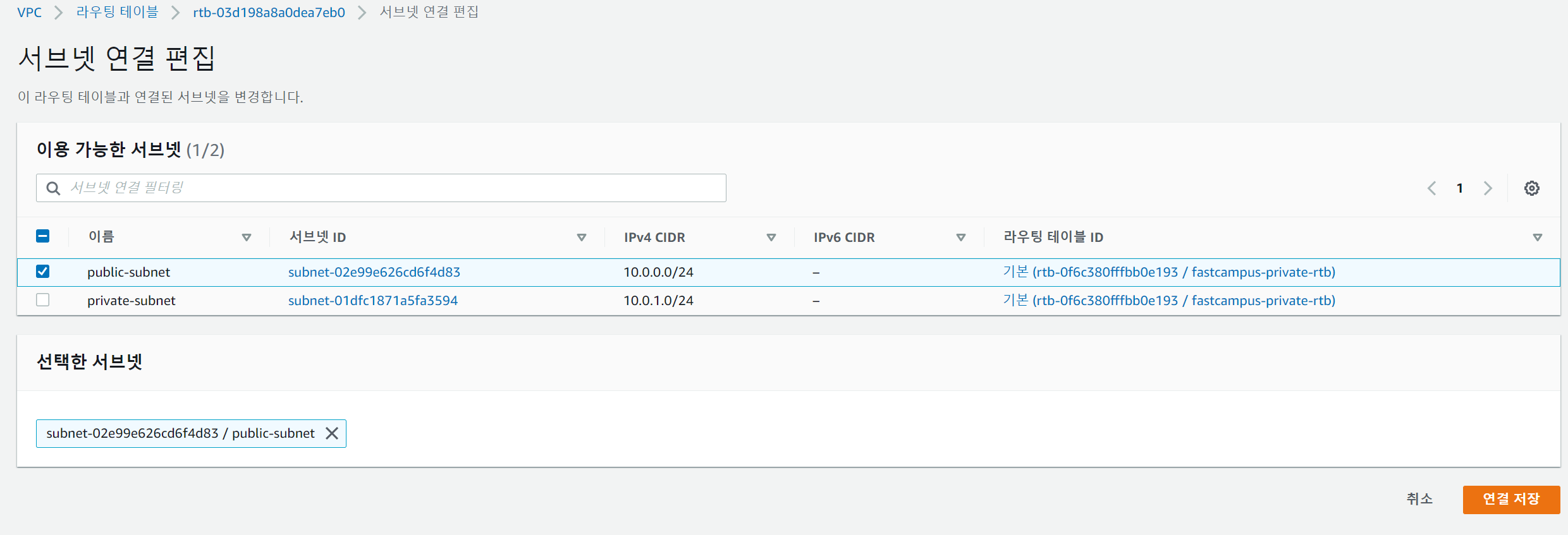 public rtb를 선택하고 작업⇒ 서브넷 연결 편집을 통해 진입한다.