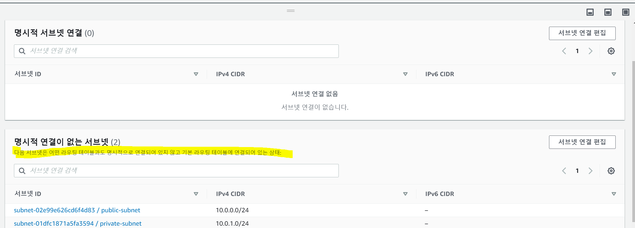 서브넷 연결 항목을 확인하면 명시적 연결이 없는 서브넷으로, public subnet과 private subnet이 어떤 라우팅 테이블과도 명시적으로 연결되어 있지 않고 기본 라우팅 테이블에 연결되어 있는 상태라고 표기된다.