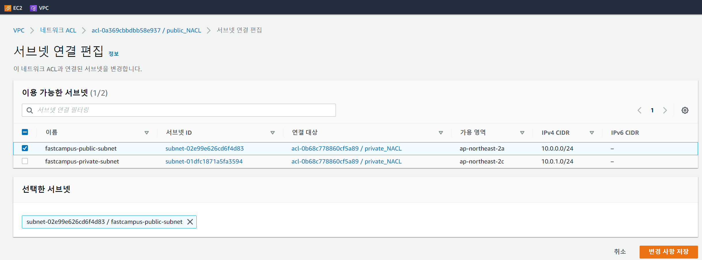 연결 대상을 확인하면 public NACL은 public subnet으로, private NACL은 private subnet으로 연결되었음을 확인할 수 있다.