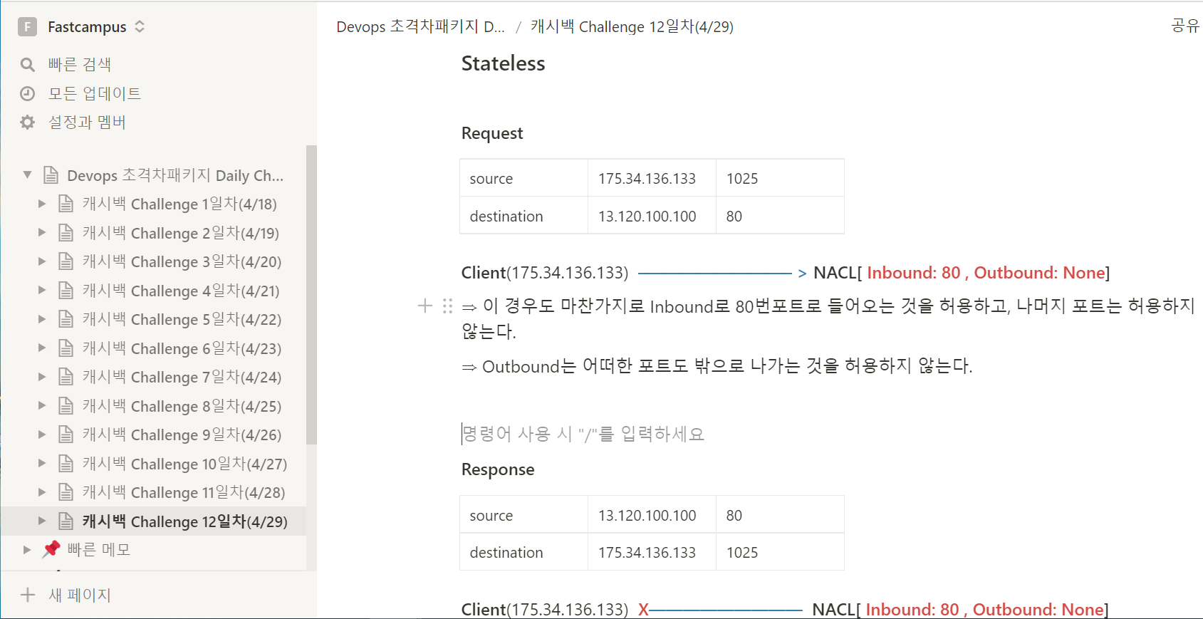 NACL 설정과 Stateless,Stateful에 관한 이론에 관한 클립을 복습하고 새로운 클립을 수강하는식으로 Challenge를 수행하였다. 다른 개발블로그들을 참고하다보면 Stateless이나 Stateful에 관한 설명이 100% 와닿지는 않았는데 본강좌를 통해 이제 잘 깨달을 수 있었던 것 같다.