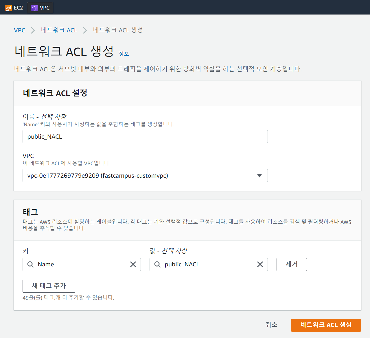 네트워크 ACL 생성을 클릭해 NACL 생성페이지에 진입하고, 생성을 해준다.
