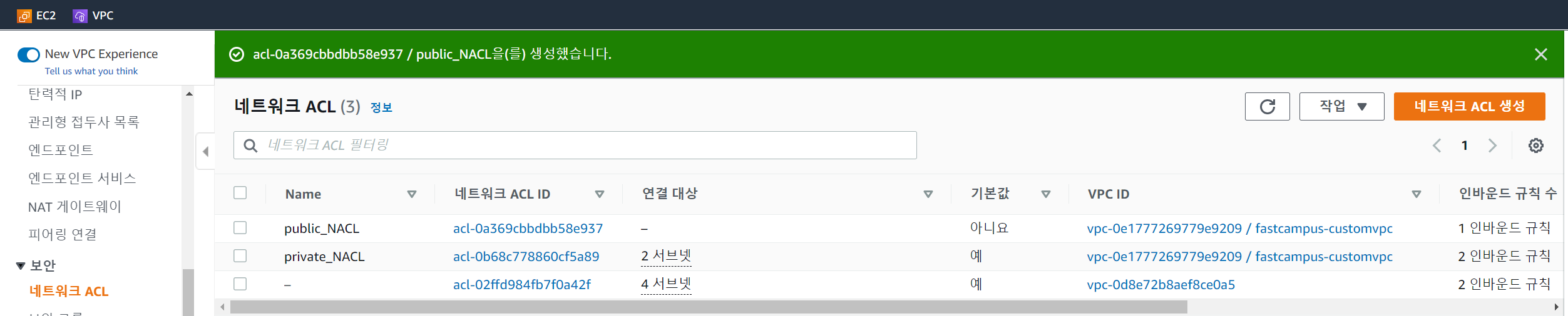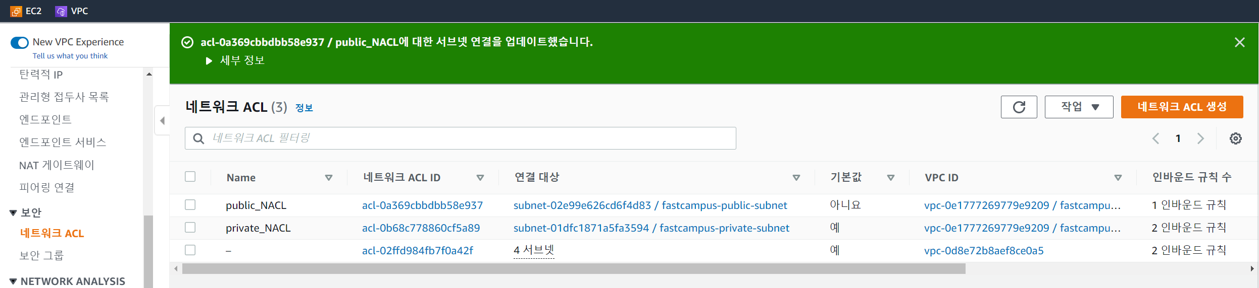 public NACL을 public subnet에 연결시킨다.