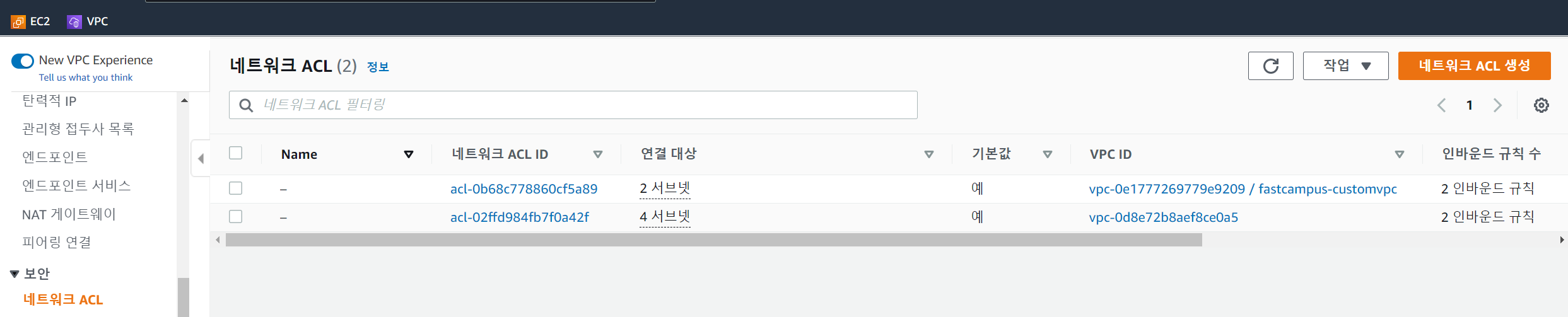 이미 기본으로 VPC에 대해 NACL이 설정되어있는 것이 있음을 확인할 수 있다.