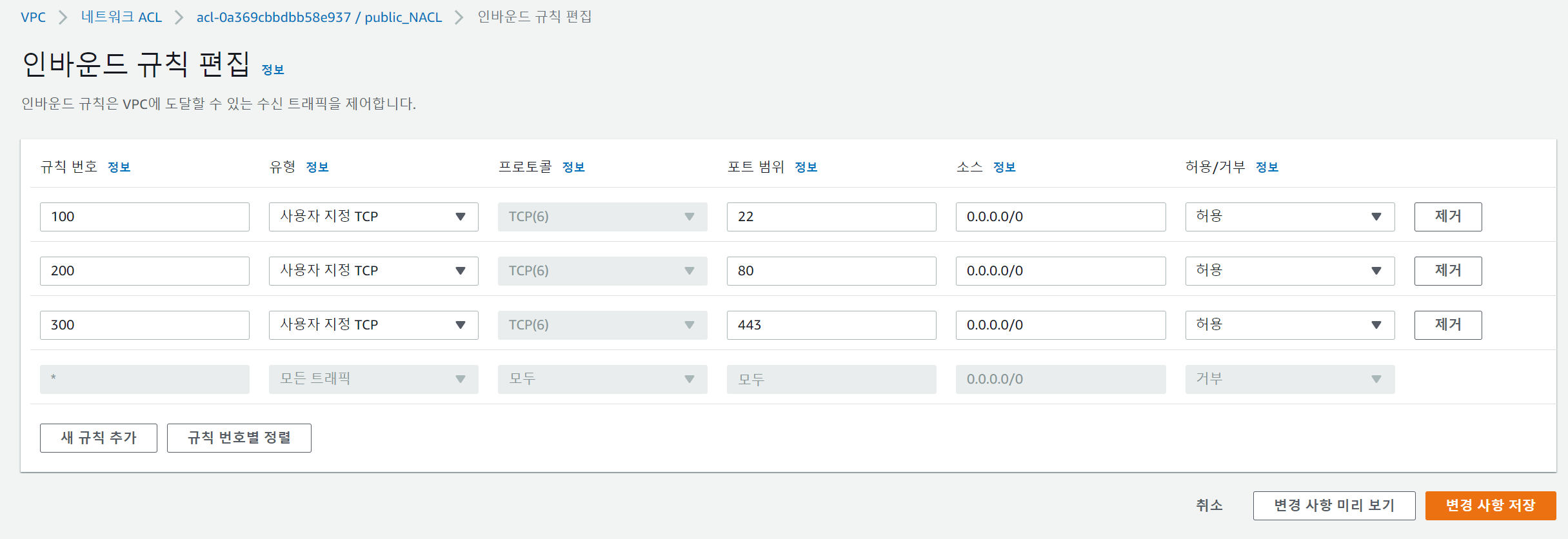 이제 public NACL에 대해 인바운드 규칙 편집을 해주면 된다.
