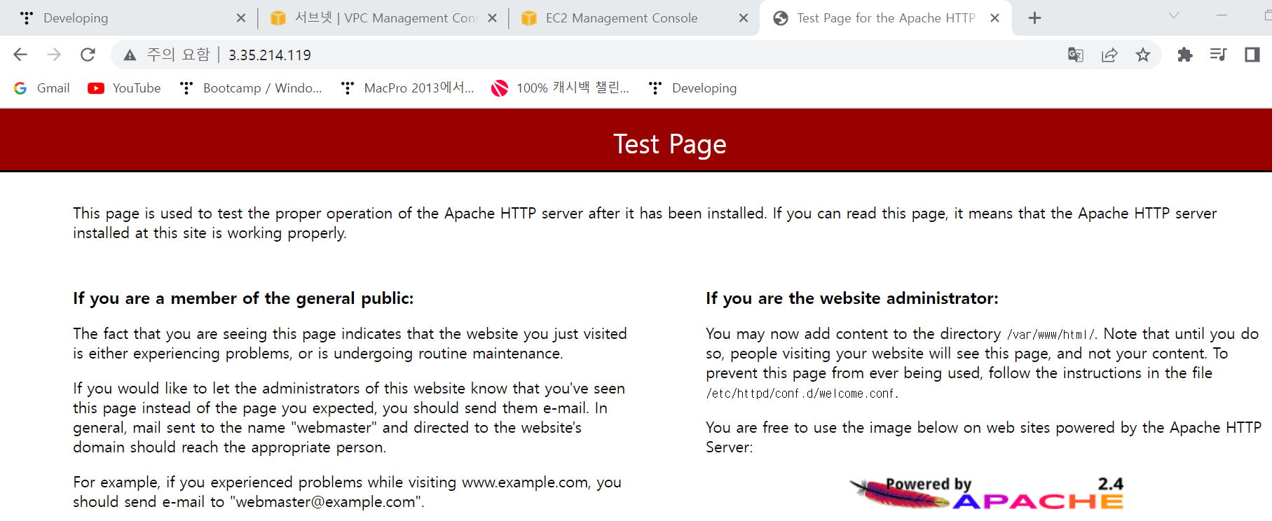 EC2가 생성되면 IPv4 주소를 복사해서 주소창에 검색해보면 apache 창이 뜨게된다.