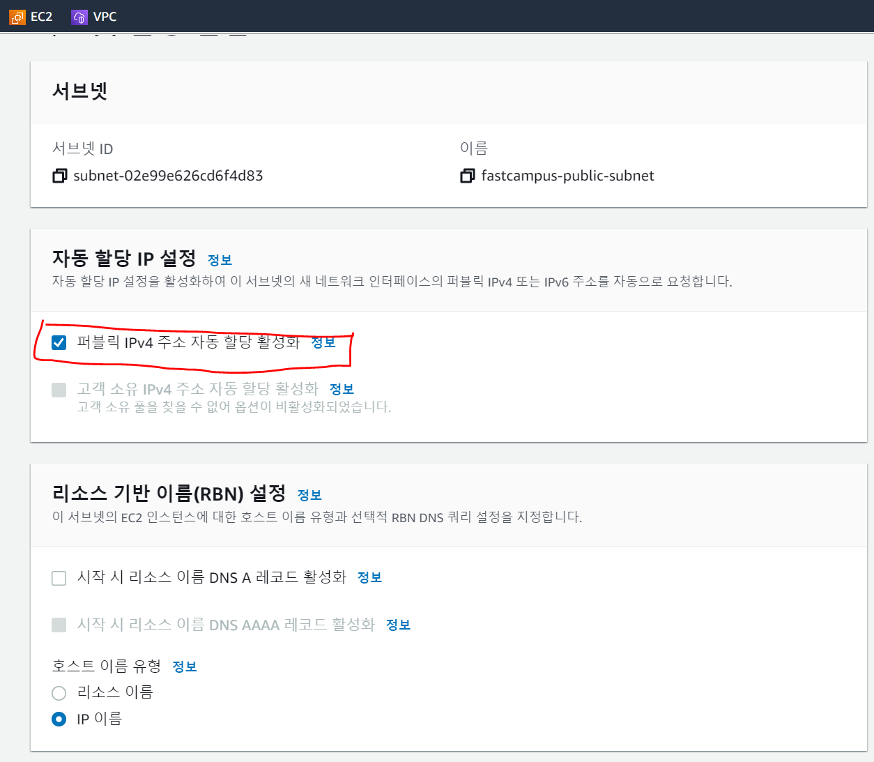 이때 퍼블릭 IP 자동할당이 비활성화로 되어있다면, 아래 2개의 작업을 해주고 새로고침하여 활성화로 되도록 한다.