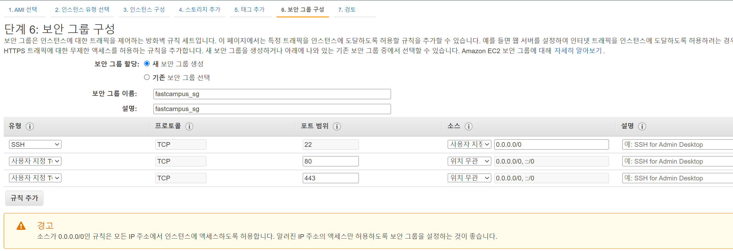 Security Group 설정하는 부분은 22포트만 열려있게 설정되있는데, http와 https에 해당하는 80과 443 포트를 열어주게 설정해준다.