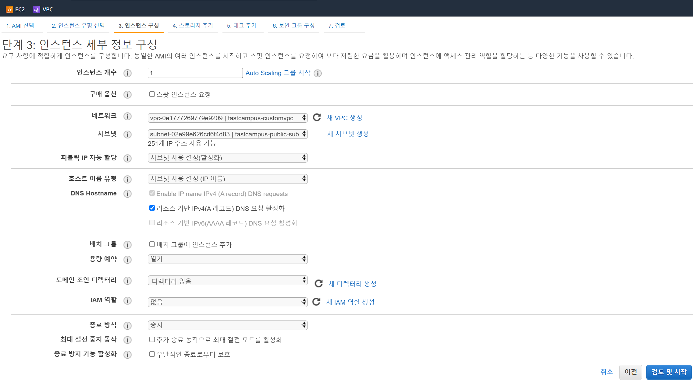 네트워크에 만들어준 vpc를 연결해주고, public subnet에 EC2를 설치하려는 것이기에 public subnet으로 설정해준다.