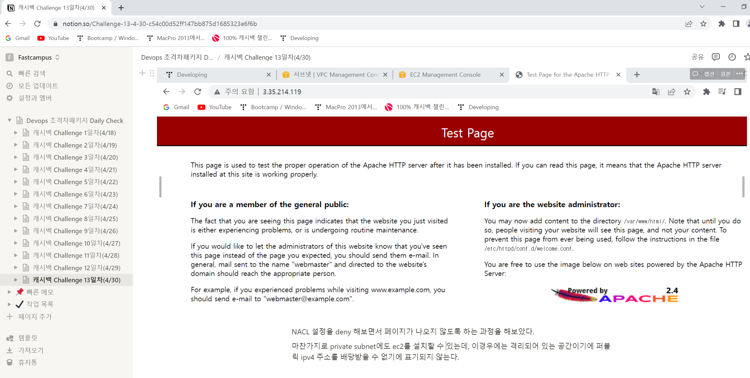 public subnet과 prviate subnet에 EC2를 띄우고 Access가 어떻게 되는지에대한 클립을 복습하고 새로운 클립을 수강하는 식으로 챌린지를 진행하였다. 약간 황당했던 부분은 ec2띄우고 IPV4 주소창에서 접속되는 여부를 확인할 때 서브넷 설정/NACL 설정/인터넷 게이트웨이/보안 그룹 모두 잘 확인했는데도 apache화면이 안나와서 "aws ec2 http doesn't work" 같은식으로 엄청 검색해보고 있었는데, 아무리 세팅 확인해도 이상한점이 없었는데 저녁먹고와서 인스턴스 지워버리고 다시 했는데도 안되서 계속 검색하다가 어느순간 페이지가 자동으로 리로드되면서 apache 화면이 등장했다. 설정 상에서 한끝으로 차이가 났다거나(그렇기에는 꼼꼼하게 많이 확인했다) aws 상의 문제로 동작이 잘 안된 경우같았다. 하여튼 ec2 접속해서 방화벽쪽 건드는 내용까지 보려다가 갑자기 되버려서 아주아주(?) 다행이라고 생각했다.NACL 설정 deny allow 해보면서 port 막고 열리게 하는 것도 해보았다.