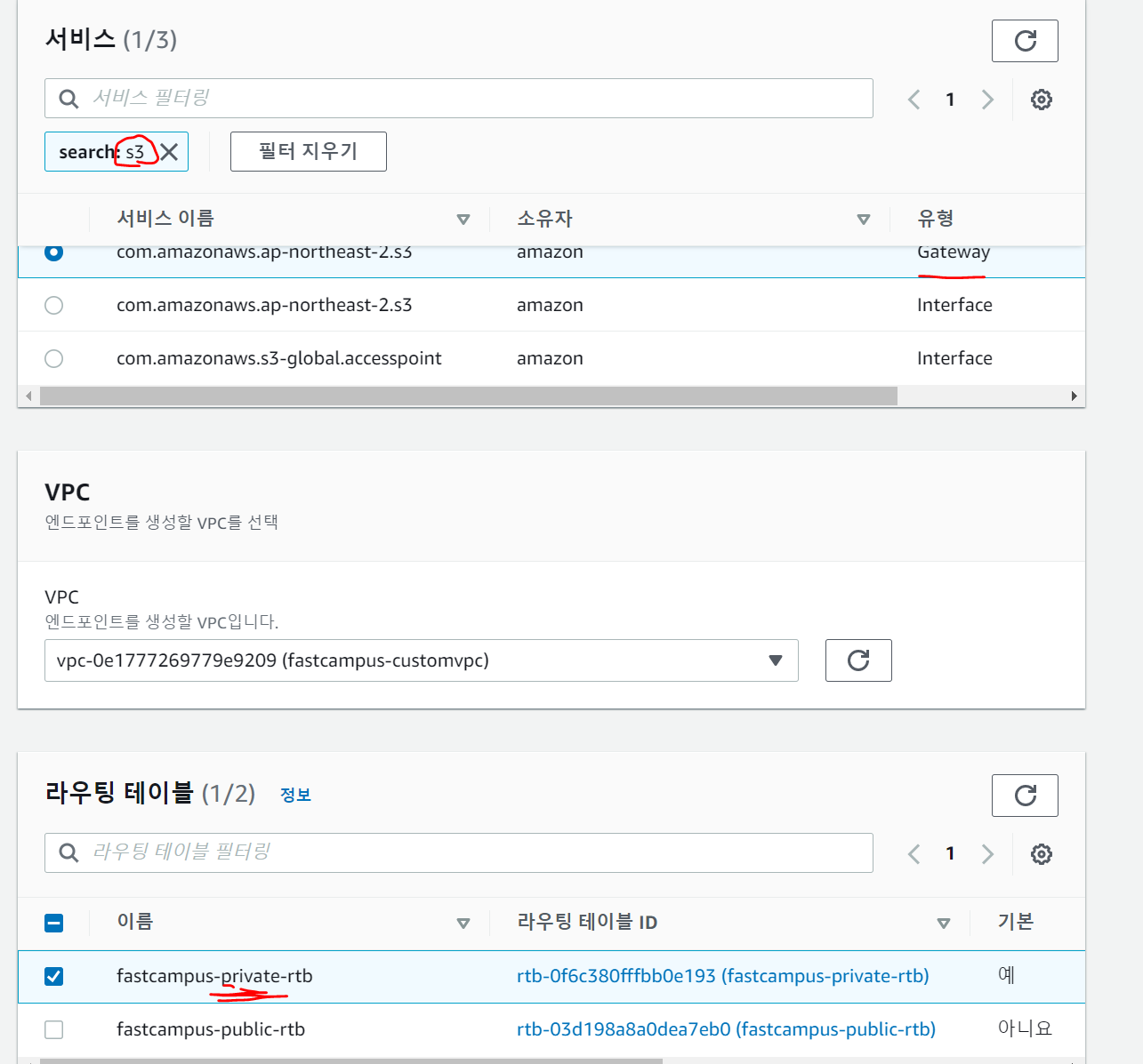 서비스 항목에서 S3를 검색하고 Gateway 유형인 것을 선택해준다.