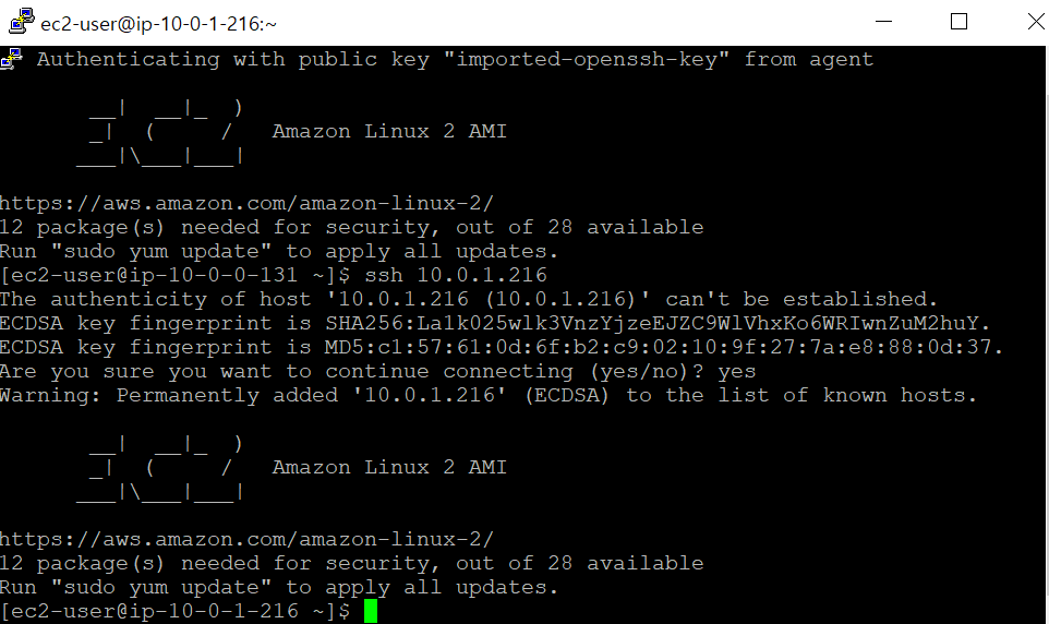 마찬가지로 지난번에 한 것처럼 putty로 접속 후 public subnet에 접속한뒤에 ssh 때려서 private subnet에 접근한다.