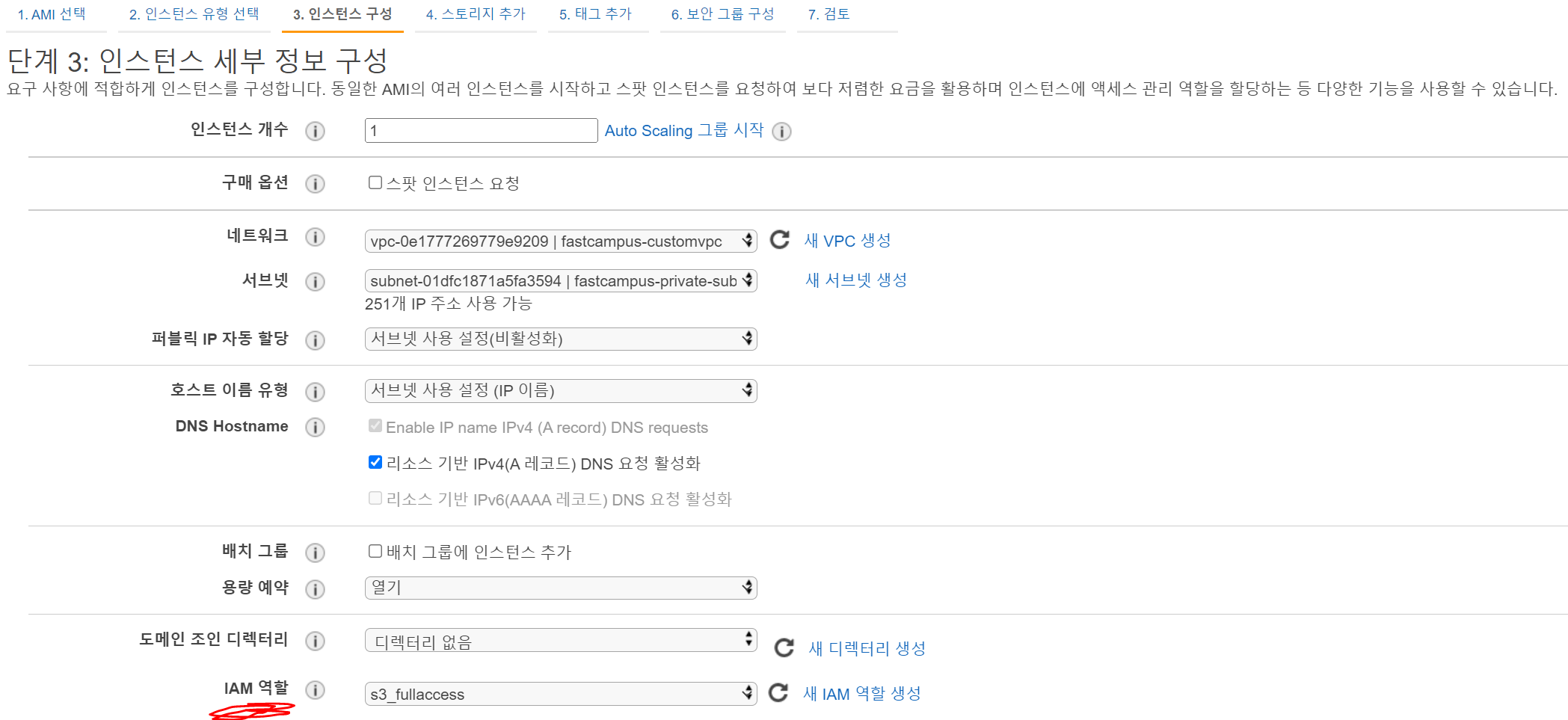 private EC2 만들때 IAM 역할에서 아까 만들어준 역할을 설정해준다.