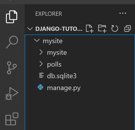 그러면 구조는 이렇게 생겼을 것이다. mysite 내부에 mysite디렉토리가 있고 생성해준 polls 디렉토리가 존재하게 된다.
