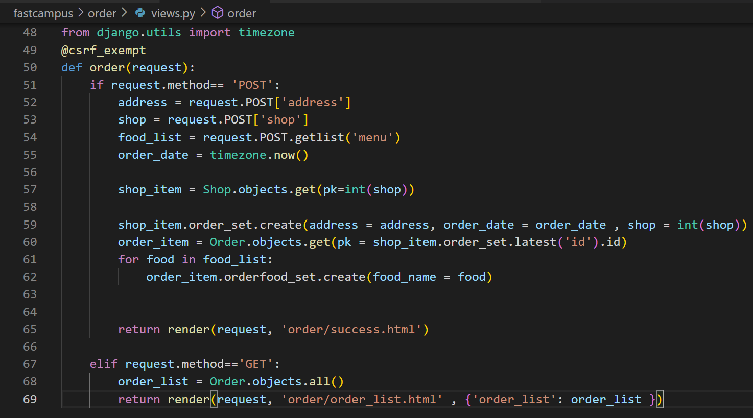 render문에 대해서 코멘트를 하자면 앞서 모든 가게에 대한 정보를 db에서 받아서 shop_list 라는 이름으로 order/shop_list.html 에 태워보내는 것이다.