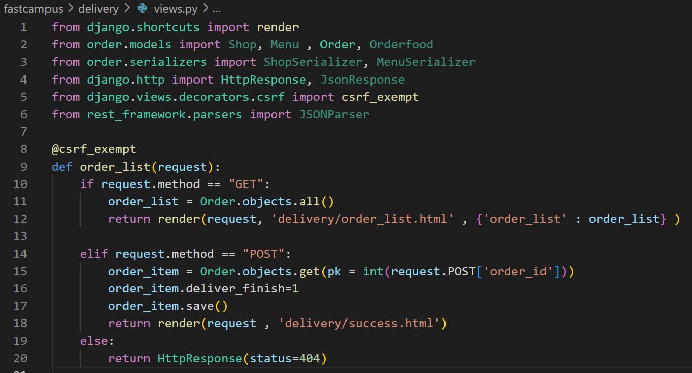 urlpatterns의 path는 deliver/orders 로 들어오는 경우에 배달기사가 주문현황을 확인하고 배달이 완료되었음을 확정짓도록 하는 함수와 연결시켜준다.
