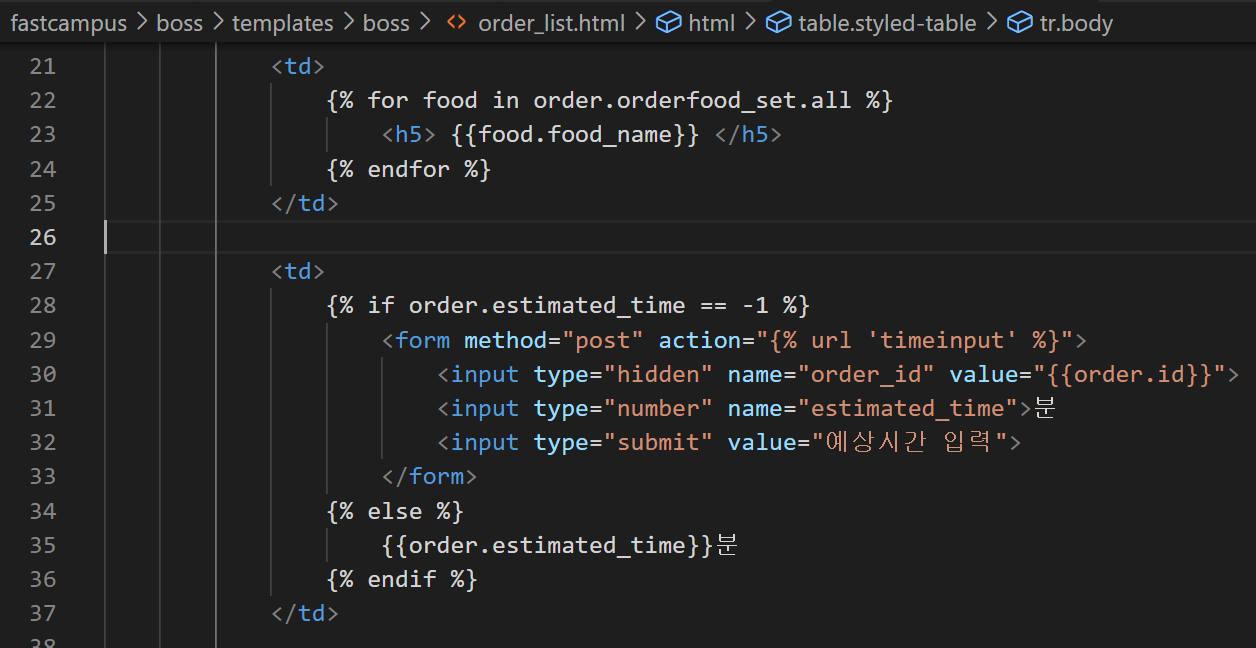 boss/templates/boss 까지 directory를 추가해주고 그 내부에서 주문현황을 보여주는 order_list.html, post 완료하고 안내창을 보여줄 success.html을 생성해준다.