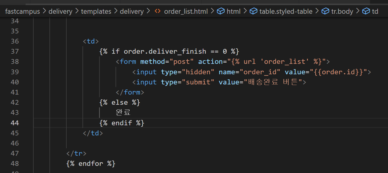 delivery/templates/delivery 디렉토리까지 생성해주고, 배달기사가 주문현황을 확인할 수 있는 order_list.html과 배달확정을 완료했다는 알림을 주는 success.html을 생성해준다.