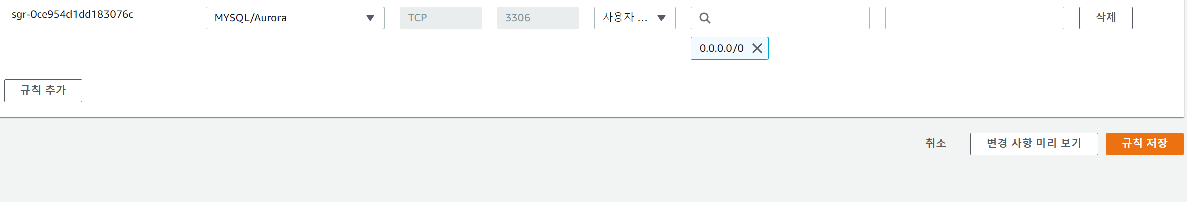 EC2 ⇒ 보안그룹에서 MYSQL을 TCP로 열어주는 설정을해준다.