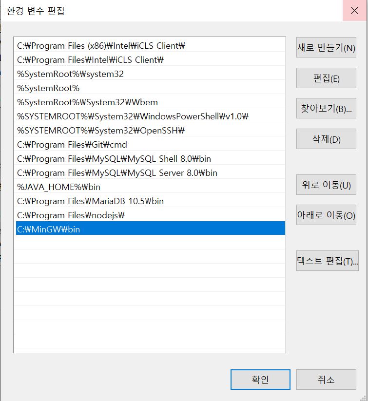 새로 만들기 탭을 누르고 C:\MinGW\bin 를 입력해준다.
