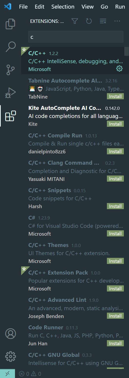 2.VSCode의 왼쪽 메뉴바에서 맨밑의 Extensions 메뉴를 선택한 후, c를 검색한다.