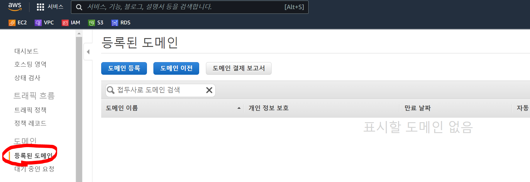 route53서비스를 활용하여 도메인을 등록하기 위해서는 route53 서비스를 검색하여 등록된 도메인 항목으로 이동하고, 도메인 등록을 선택한다.