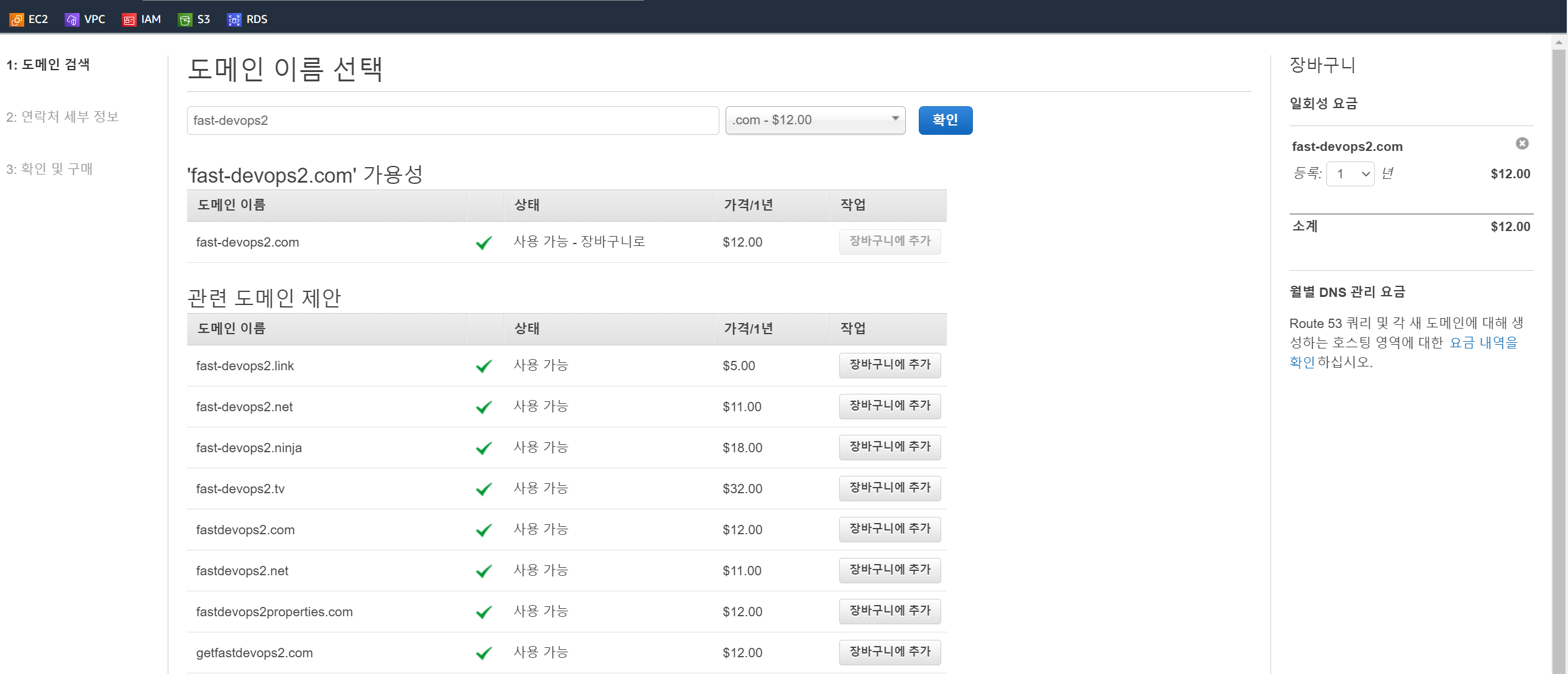 입력한 도메인이 사용가능한지 여부를 확인하고 장바구니에 추가를 선택하면 등록 년수를 설정할 수 있다. 그 이후에는 약관동의와 정보입력을 해주면 된다.