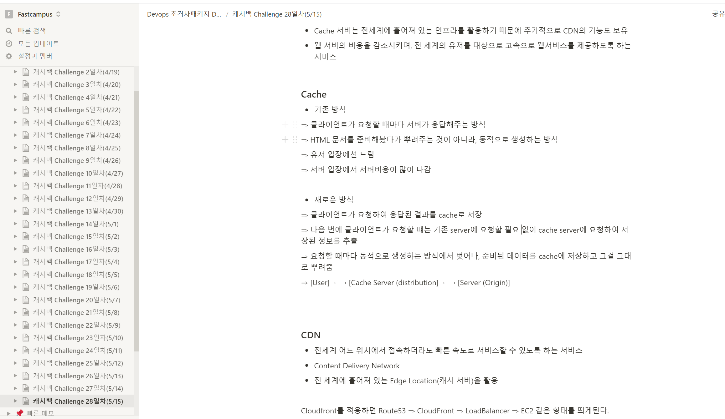 AWS Cloudfront와 CDN과 관련된 클립을 수강하는식으로 챌린지를 수행하였다. 단기 인턴할때에 어느정도 많이 찾아보던 내용들이라 쉽게 이해가 갔었던 것 같다. 어느덧 4주차에 접어들었고 다음주에 중간미션과 관련된 포스팅도 따로 하게 될 것이다. 다음 포스팅은 Nginx/Gunicorn/Supervisor에 관한 포스팅을 할 예정이다.