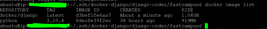 방금 만든 Dockerfile에 해당하는 도커 컨테이너의 이미지를 생성해준다. 여기서 docker/django는 디렉토리가 아니다. 이미지의 이름에 해당한다. 그 이미지 안에 현재 디렉토리안에서 실행시키라는 의미이다.