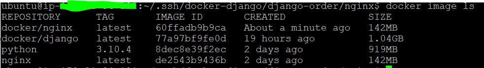 이미지가 빌드되어있는 것을 확인할 수 있다. python과 nginx는 docker에서 기본적으로 제공되는 이미지라고 생각하면된다.