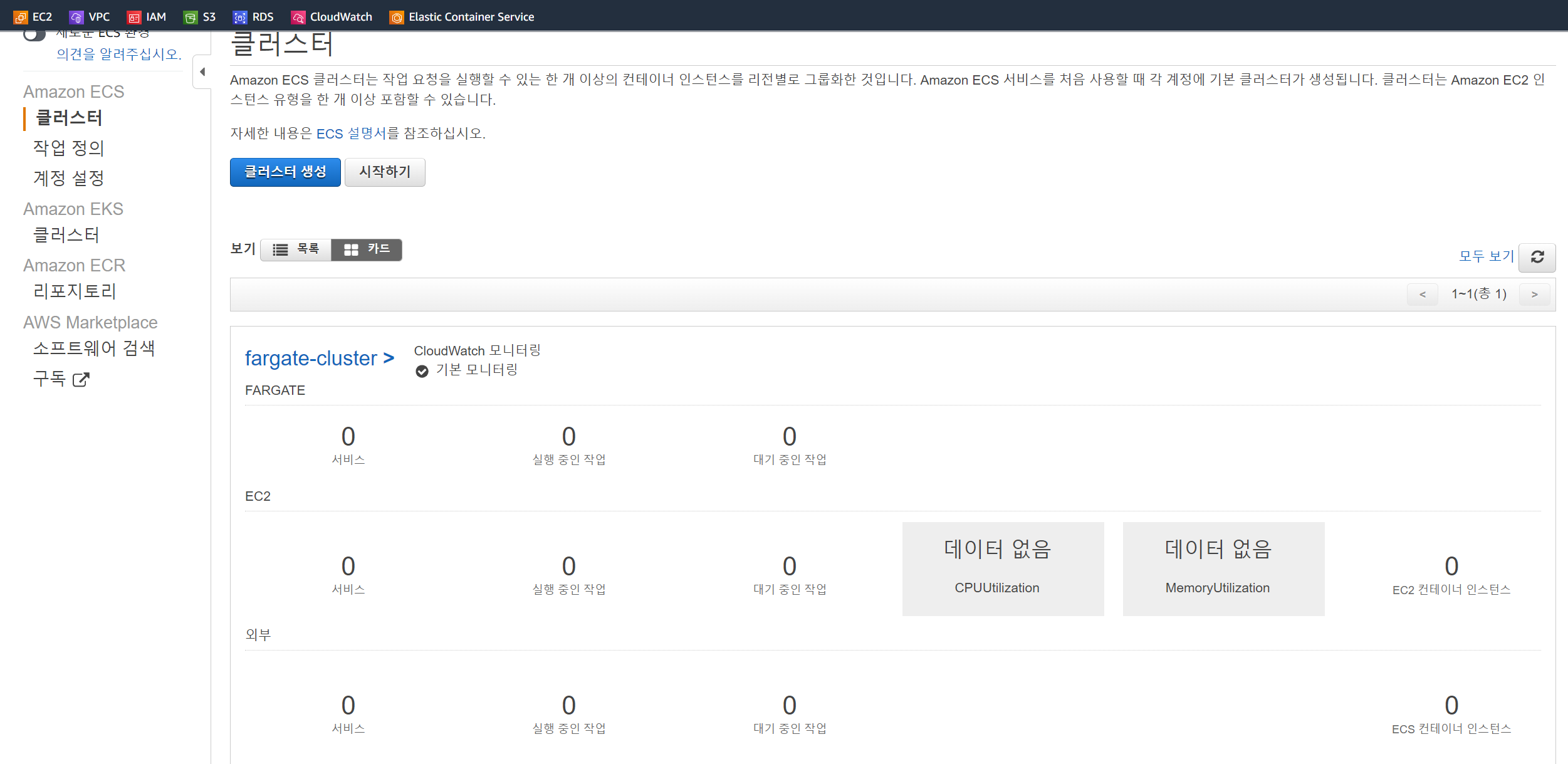 fargate을 위한 cluster가 생성되었음을 확인할 수 있다.