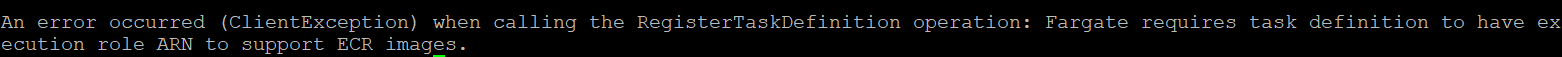 이때 위와같이 에러가 발생할 수 있다. 공식문서에서처럼 공개된 이미지가 아니라 custom으로 만들어준 개인 이미지에 접근하기 위해서 권한이 필요하다는 내용이다. IAM에서 설정해줄 수 있지만 cli 환경에서도 설정해줄 수 있다. 이것에 대한 설정을 해주기 위해 ecs-task.json을 만들어준다.