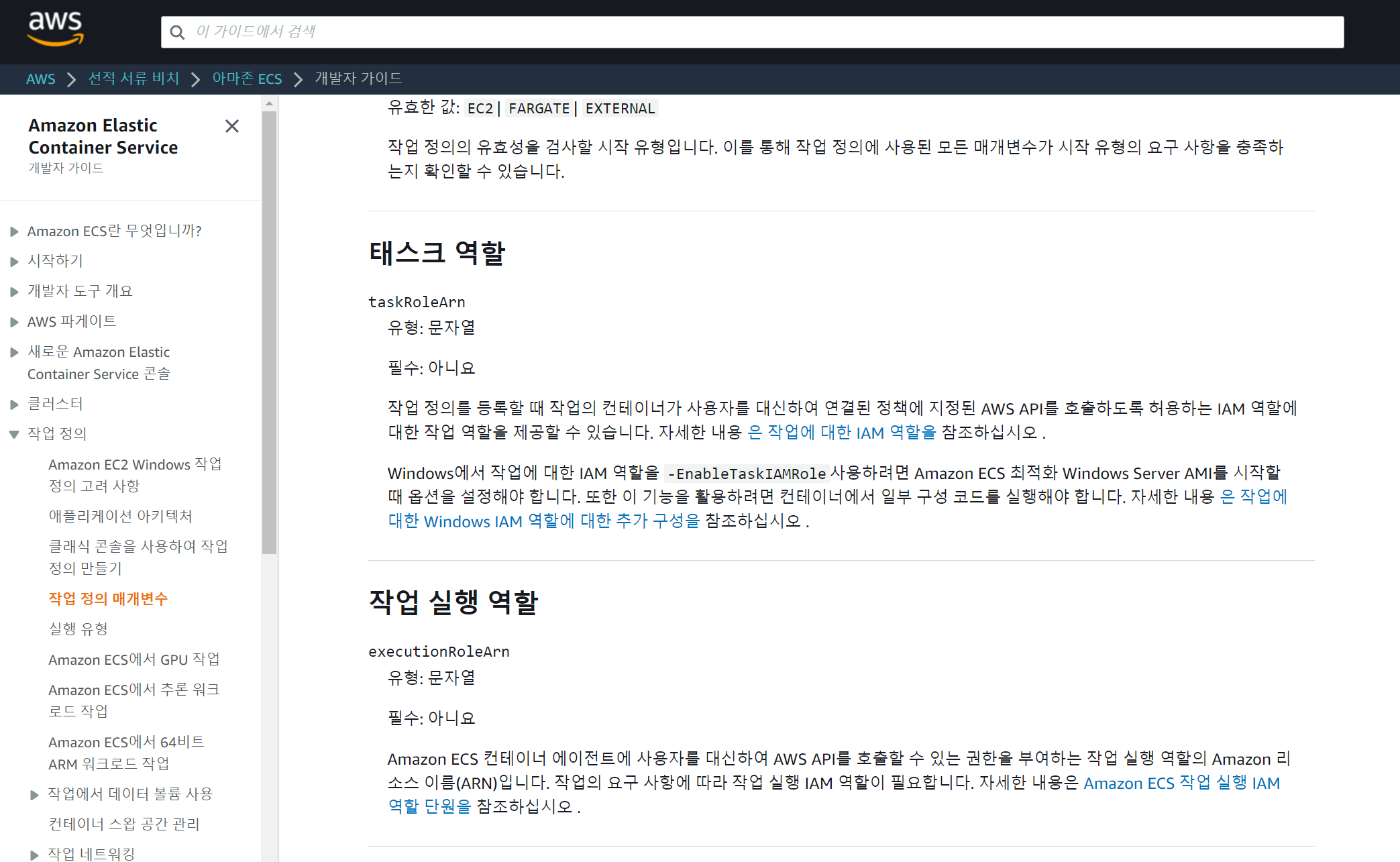 aws 공식문서에 executionRoleArn 이라는 내용이 있다. 원래는 필수적인 옵션이 아니지만 직접적으로 ECR에 접근해야하기때문에 필요한 내용이다.