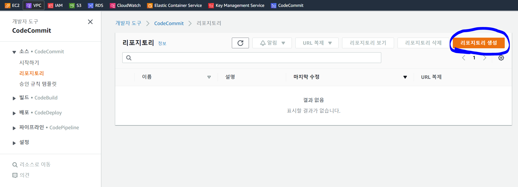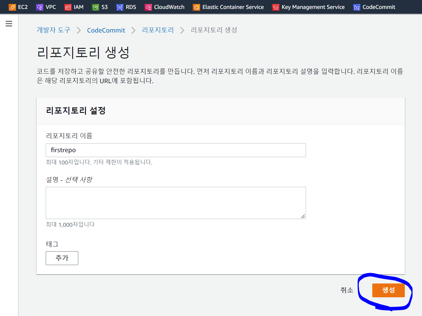 Github처럼 pull을 해오려면 레포지토리를 생성해주어야한다. CodeCommit을 검색하고 레포지토리 생성페이지에 진입해준다.