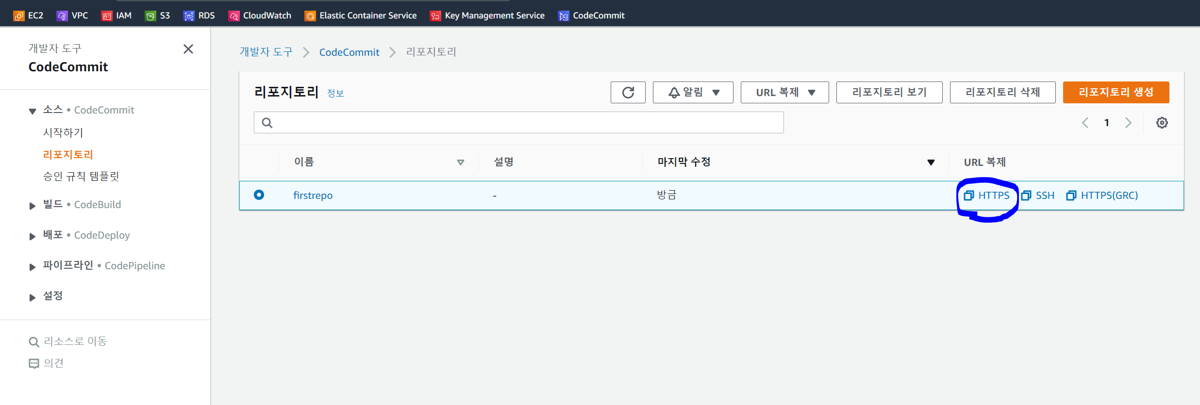 AWS CodeCommit에 대한 HTTPS Git 자격증명란에서 자격 증명생성을 생성해주어야한다.