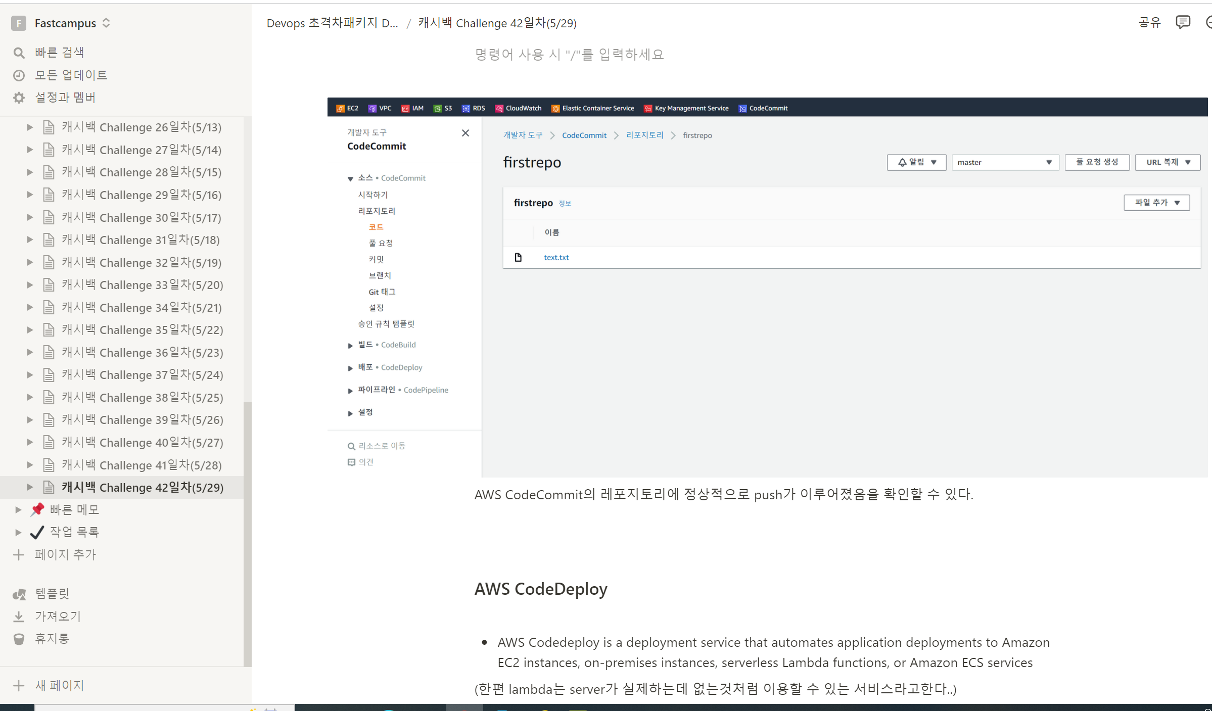 AWS CodeCommit과 CodeDeploy에 관한 클립들을 수강하는식으로 챌린지를 진행하였다. CodeCommit은 처음들어본 AWS서비스인데 github과 거의 유사한 git repository 제공서비스로 보였다. github에서 하던것처럼 git 명령어도 유사하게 사용하면되니 많이 편리하였던 것 같다. 다음 포스팅부터는 대규모 아키텍트 파트로 넘어가서 Microservice쪽을 중점적으로 다루며 포스팅을 하게 될 예정이다. 어느덧 6주차가 마무리되었는데 여태까지 하루도 안끊기고 포스팅한게 살짝 뿌듯해진다..ㅎㅎ