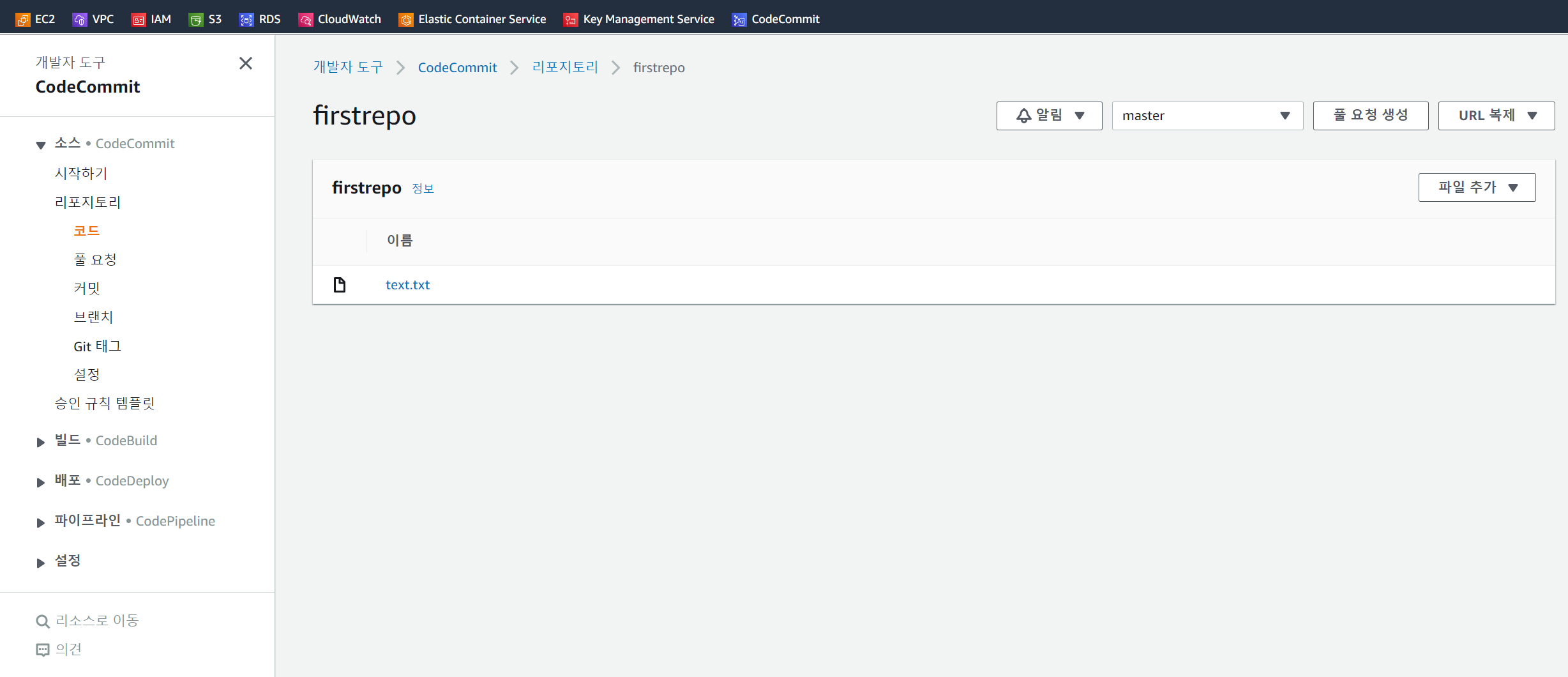 AWS CodeCommit의 레포지토리에 정상적으로 push가 이루어졌음을 확인할 수 있다.