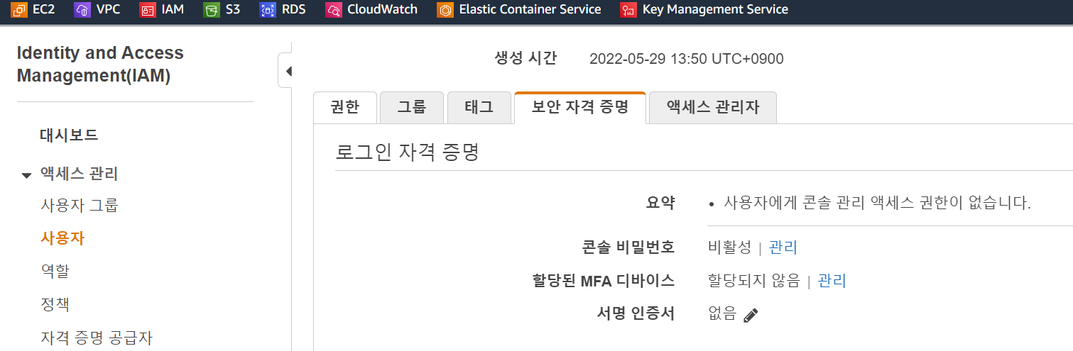 사용자가 생성되었으면 해당 사용자로 들어와서 보안 자격증명 탭을 선택한다.