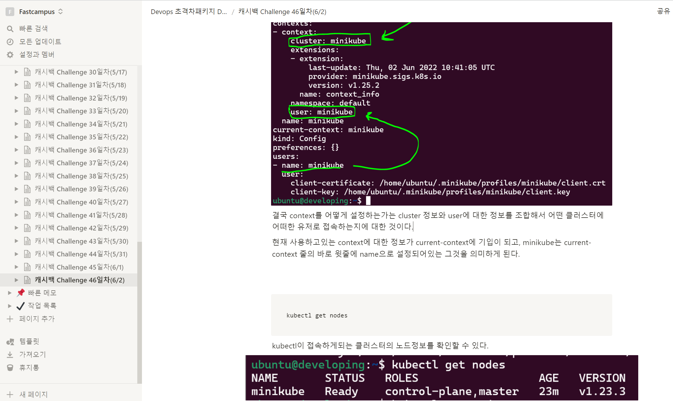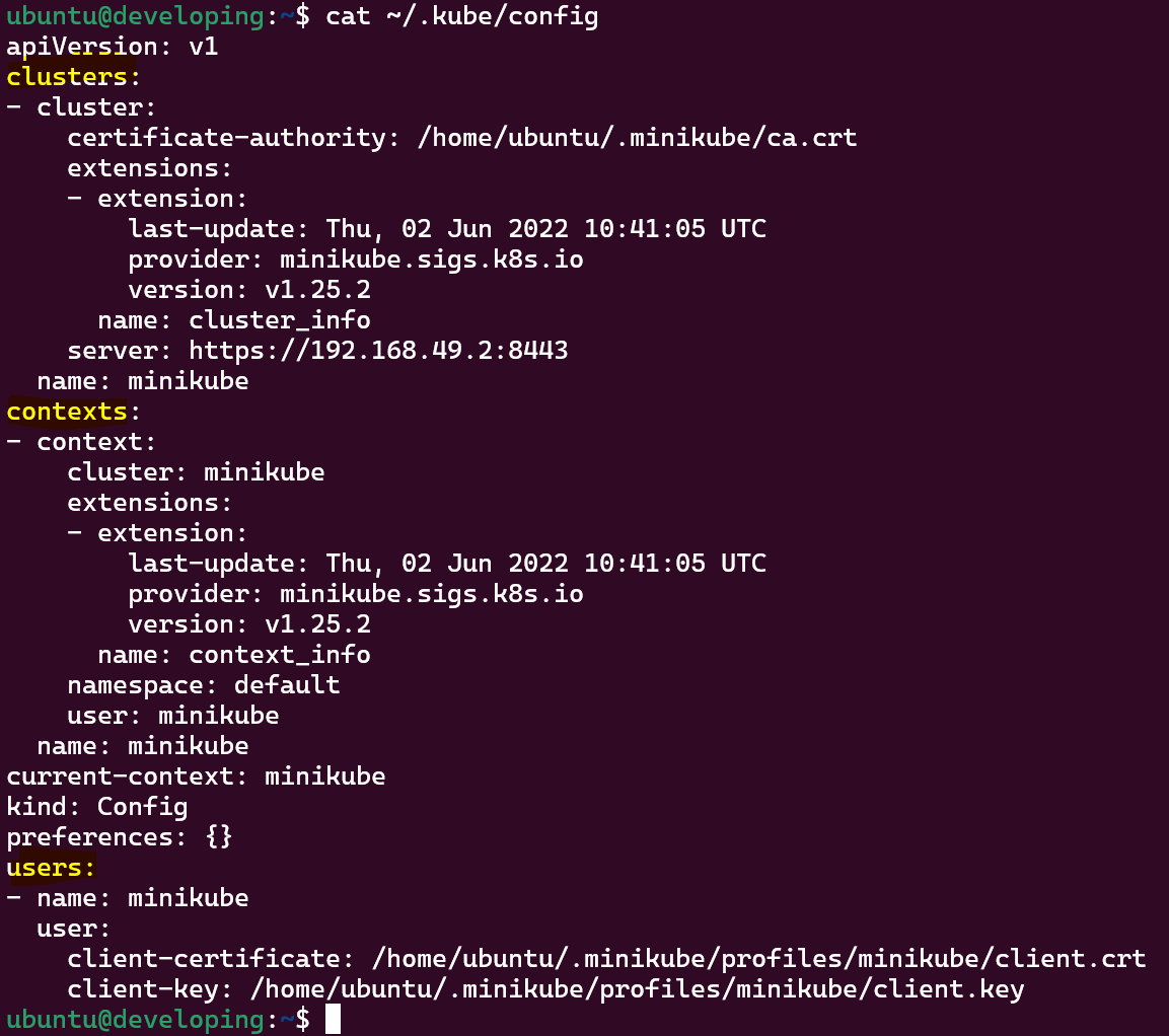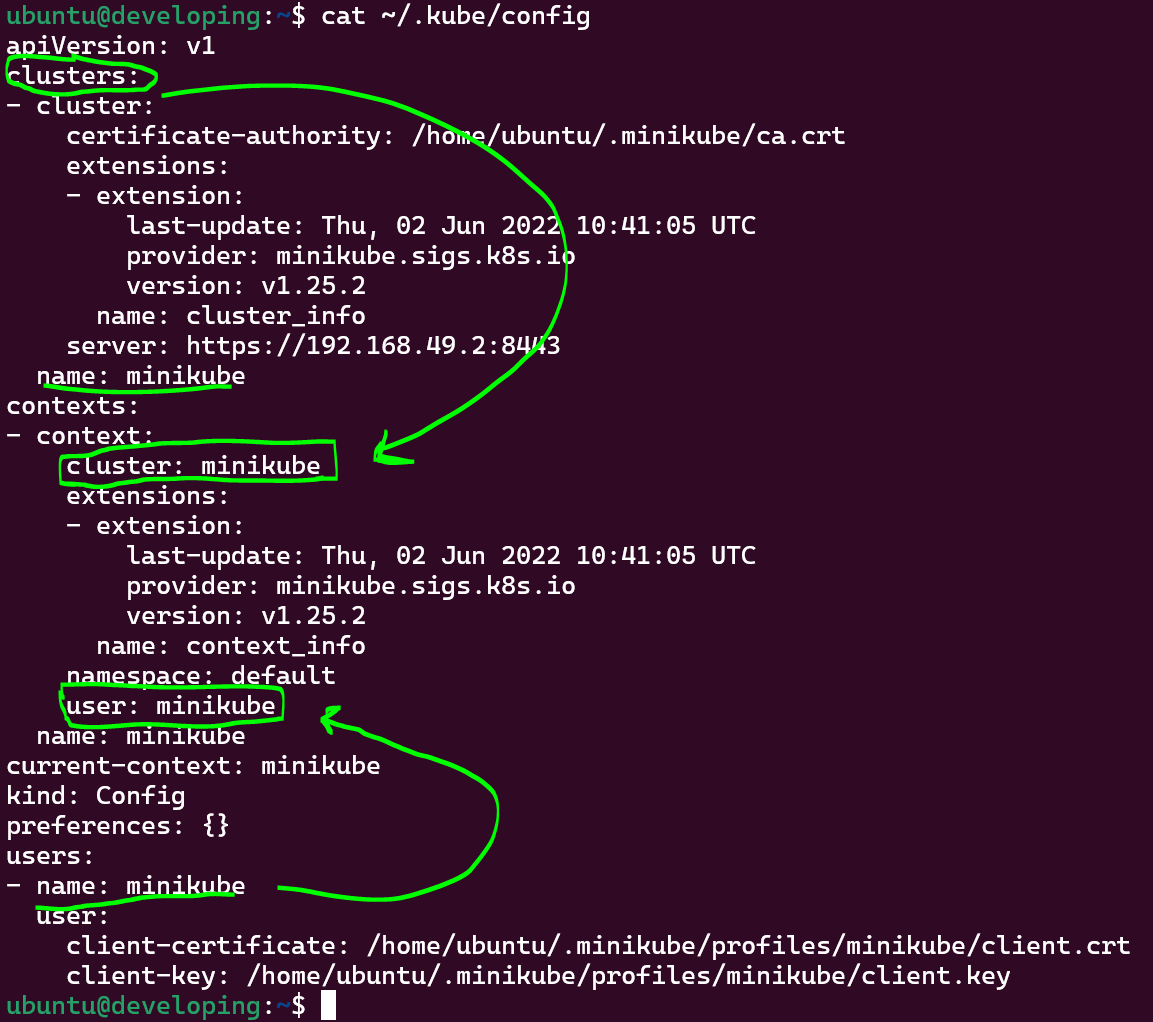 현재 사용하고있는 context에 대한 정보가 current-context에 기입이 되고, minikube는 current-context 줄의 바로 윗줄에 name으로 설정되어있는 그것을 의미하게 된다.