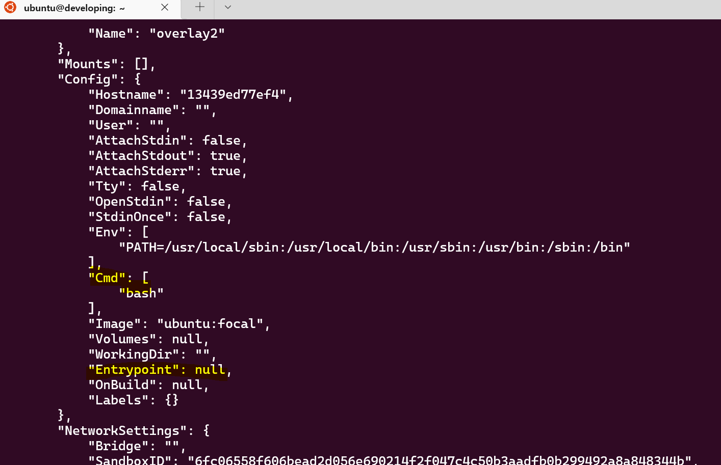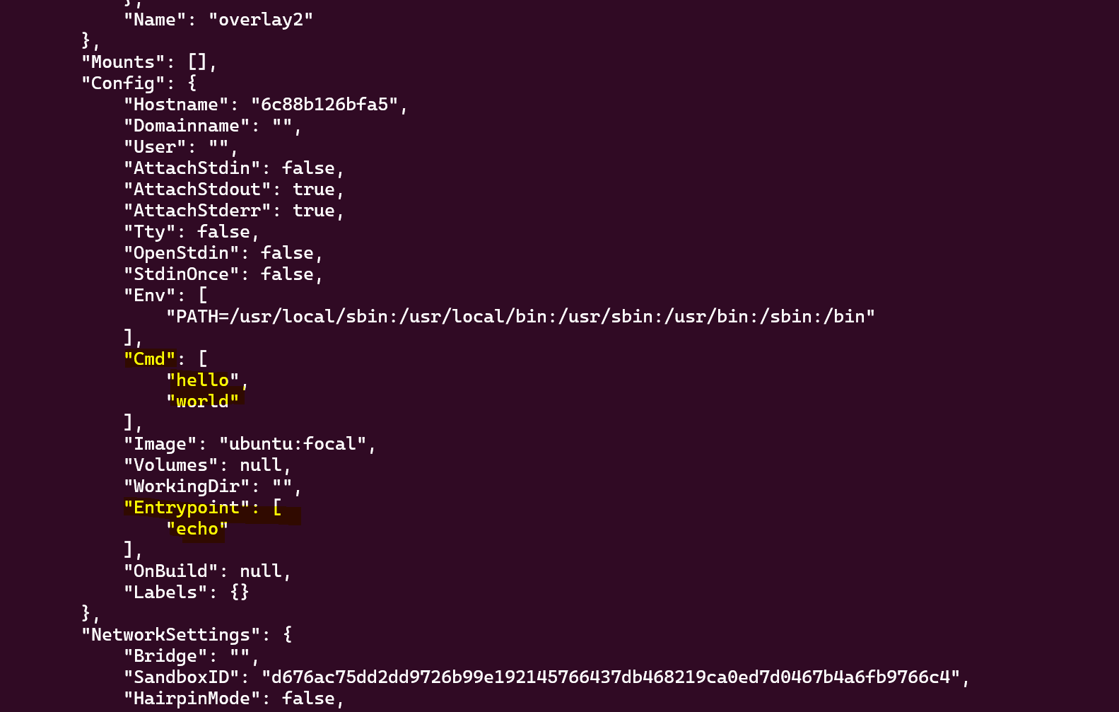 Entrypoint가 echo, CMD로 hello world가 있음을 확인할 수 있다.