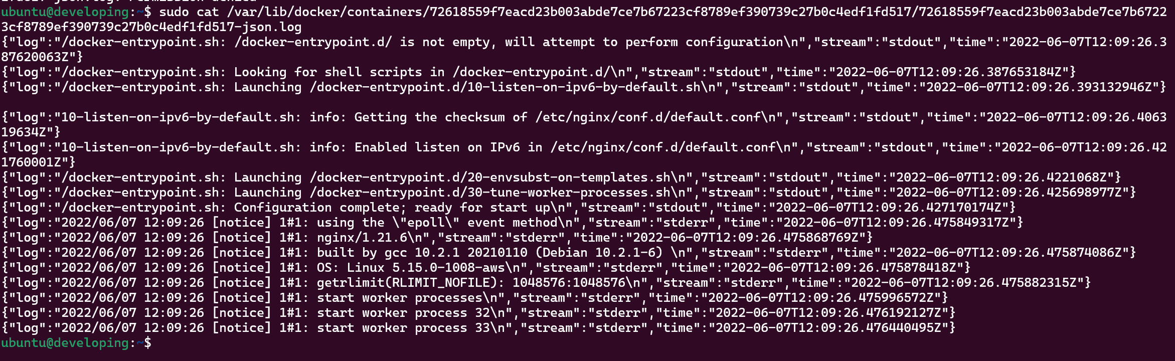 $ cat /var/lib/docker/containers/${CONTAINER_ID}/${CONTAINER_ID}-json.log