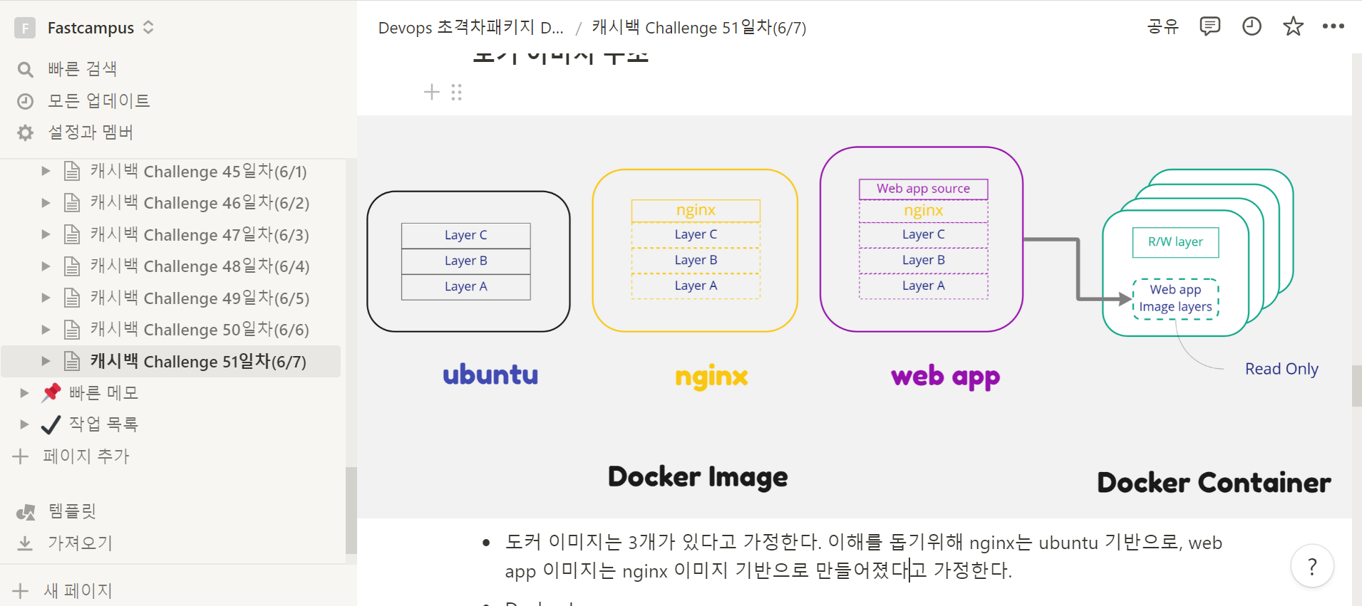 Docker log와 이미지 구조와 관련된 클립들을 수강하는식으로 챌린지를 진행하였다. docker inspect로 layer architecture로 이루어진 것을 확인할 수 있었고, git과 비슷하게 생긴 command들을 보면서 신기해했던 것 같다. 자주듣다보니 어느정도 Image layer과 container layer의 차이정도에는 익숙해진듯하다.. Docker log 관련 내용도 유익하였다. 다음 포스팅으로는Dockerfile과 관련된 내용을 포스팅할 예정이다.
