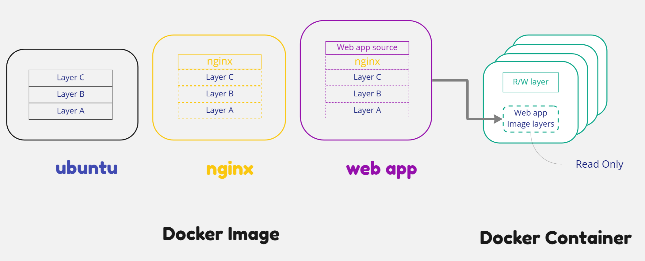 - 도커 이미지는 3개가 있다고 가정한다. 이해를 돕기위해 nginx는 ubuntu 기반으로, web app 이미지는 nginx 이미지 기반으로 만들어졌다고 가정한다.