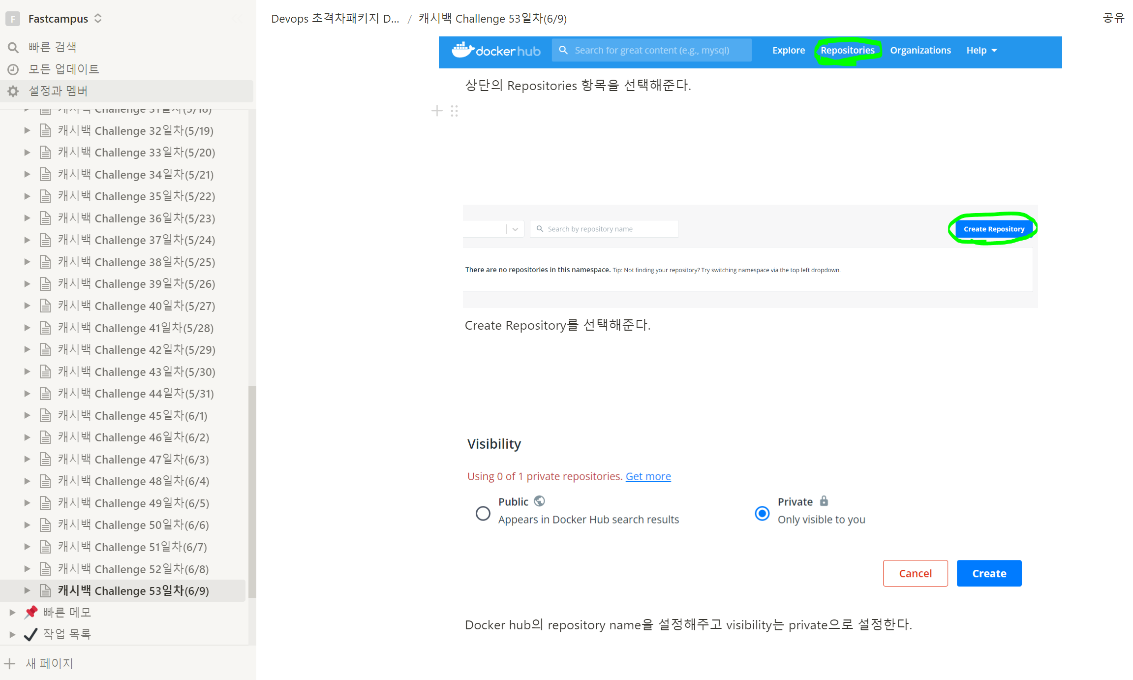 Docker hub의 repository name을 설정해주고 visibility는 private으로 설정한다.
