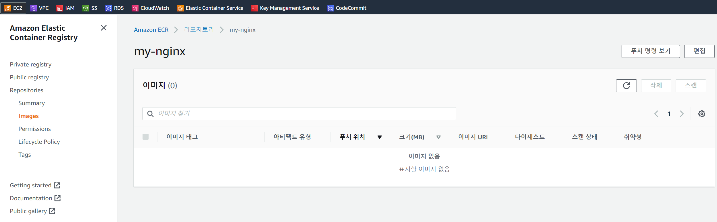 해당 레포지토리를 선택하면 이미지가 비어있는 상태이다. “푸시 명령보기”(”view push commands”)를 선택하여 command를 확인해준다.