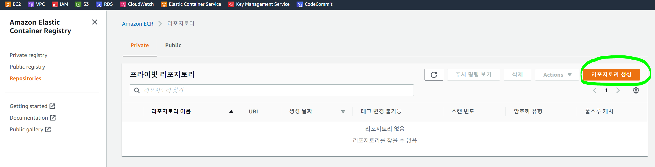 Elastic Container Registry 서비스로 접속하여 레포지토리 생성을 선택하여 생성해준다.