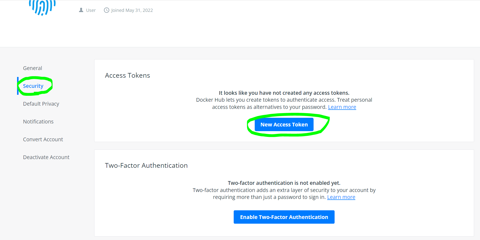 도커허브에 로그인 후 Account Settings로 이동한다.